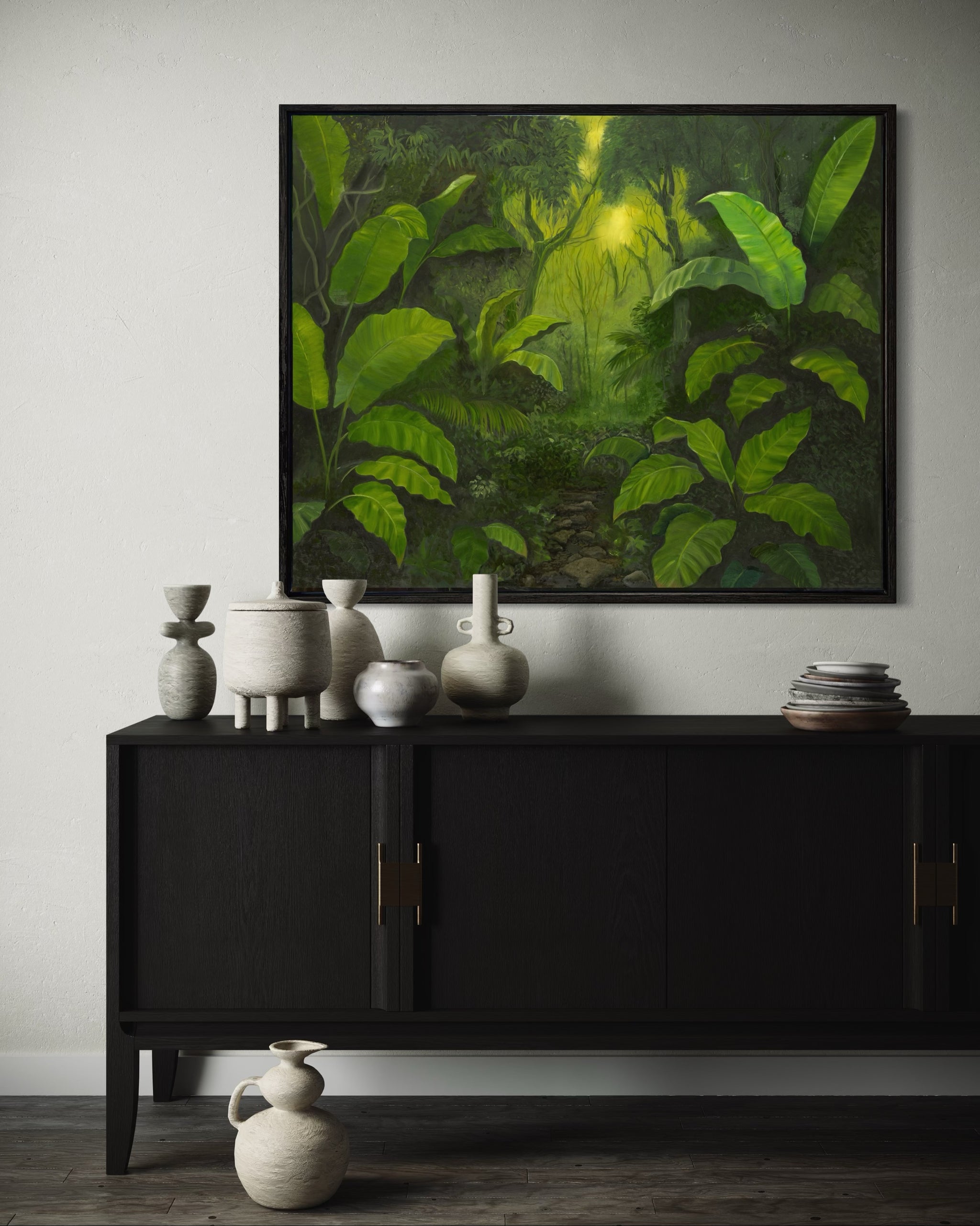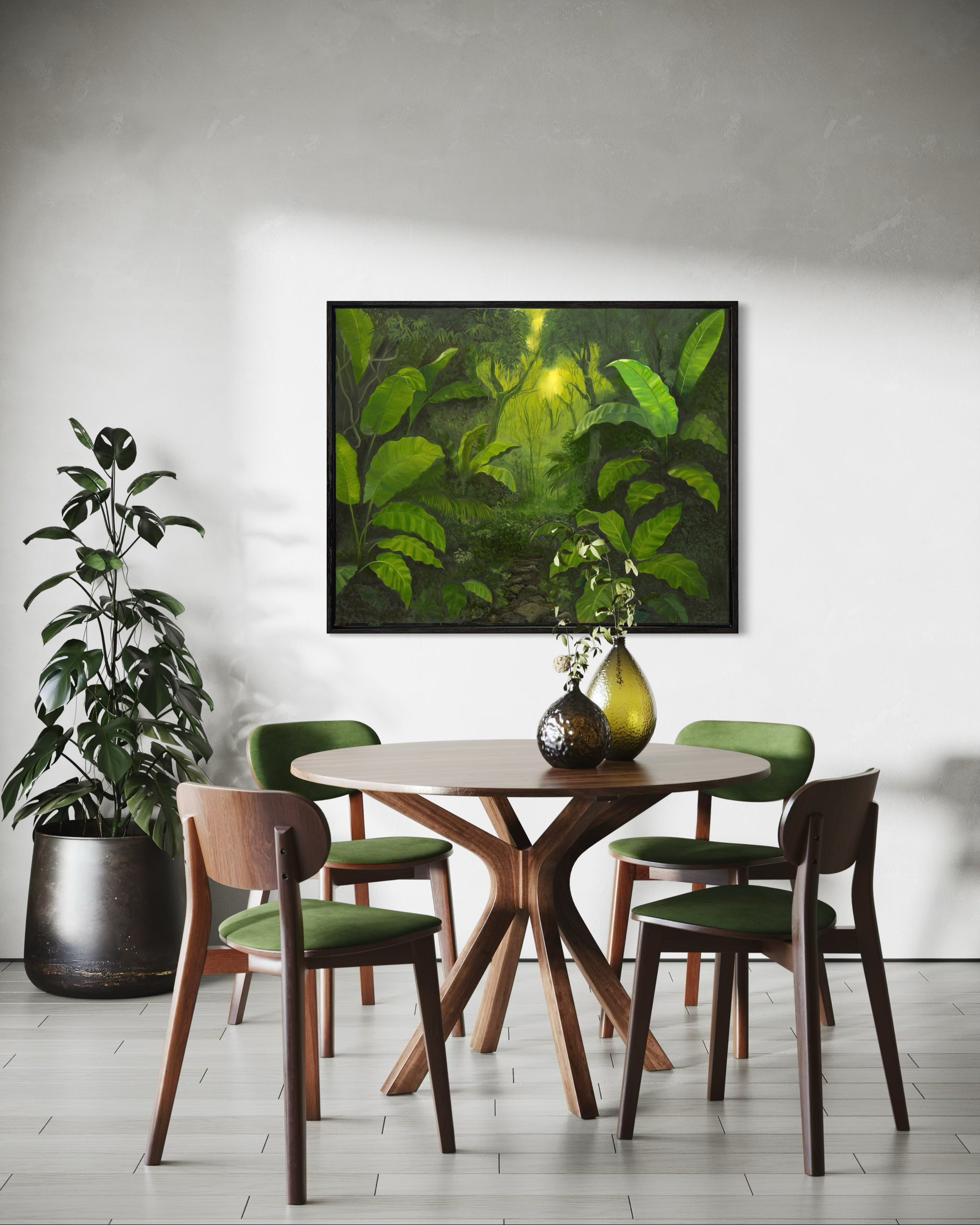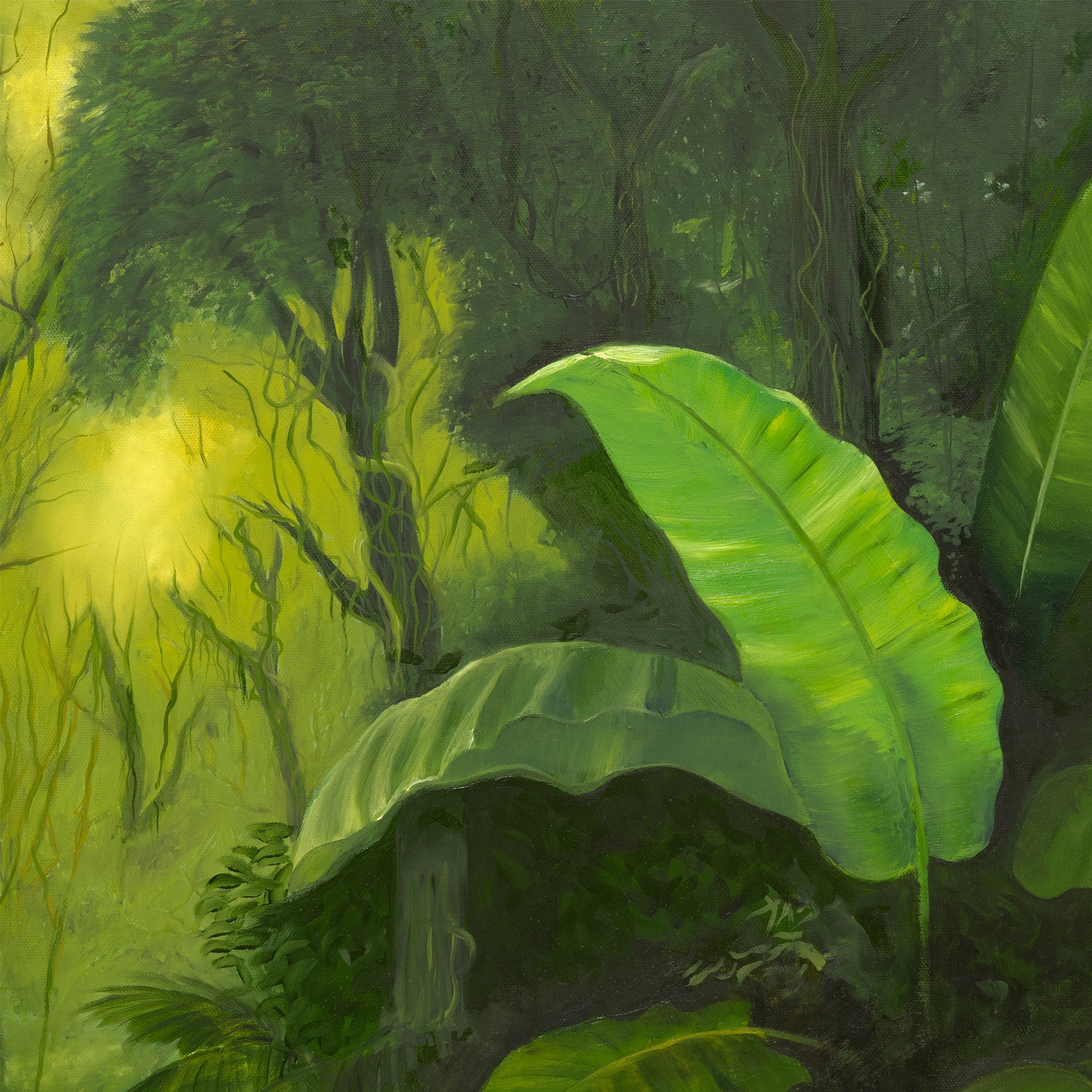 This piece captures the tranquil depth of a tropical forest bathed in glowing green light. A rich palette of greens and yellows creates a soft, almost mysterious atmosphere of quiet vitality.