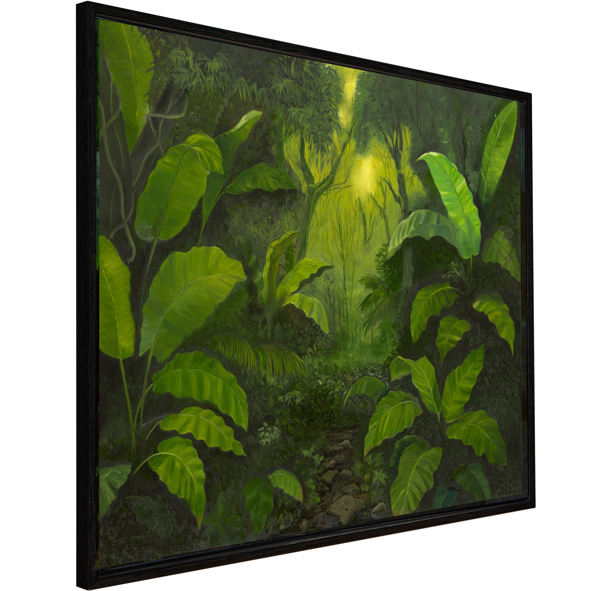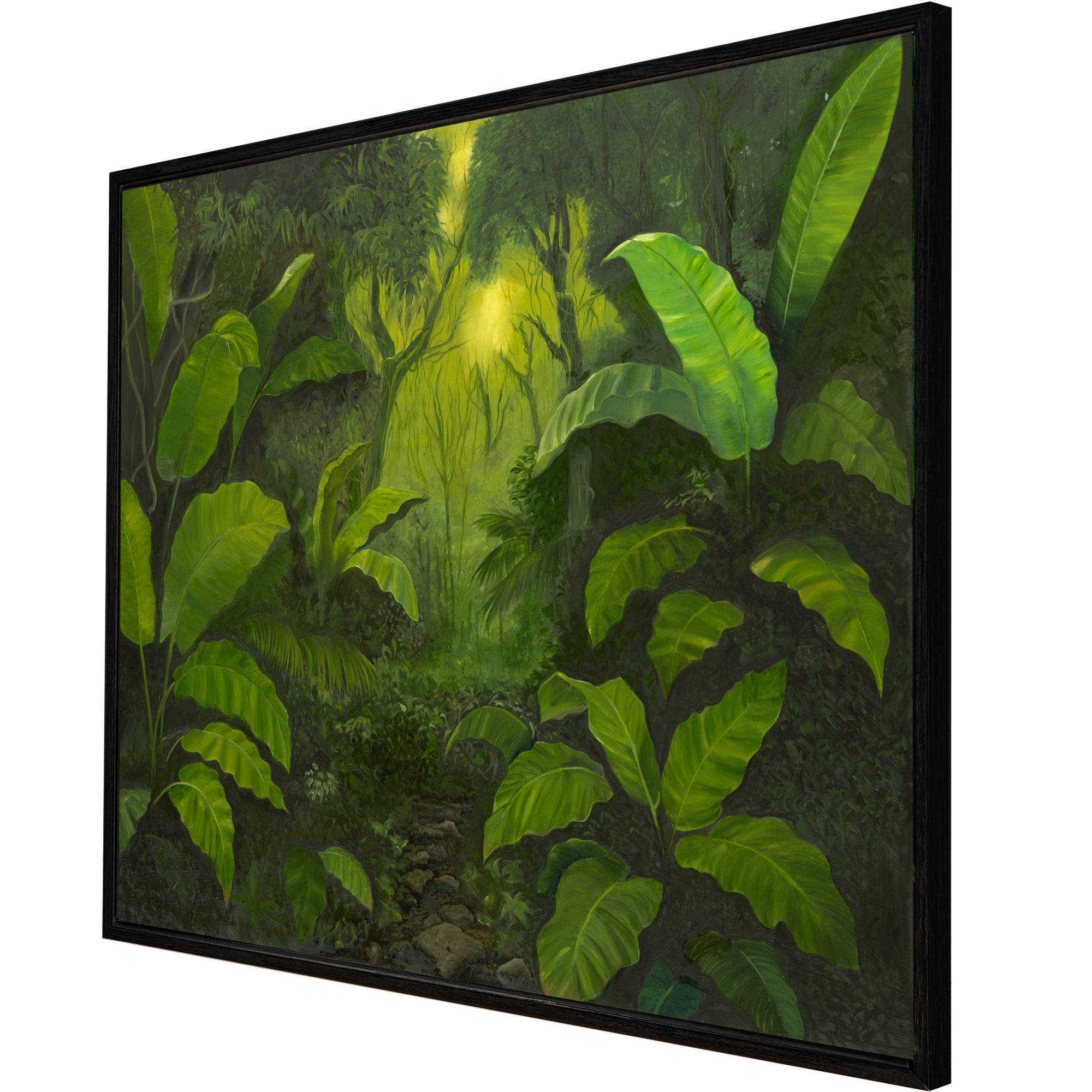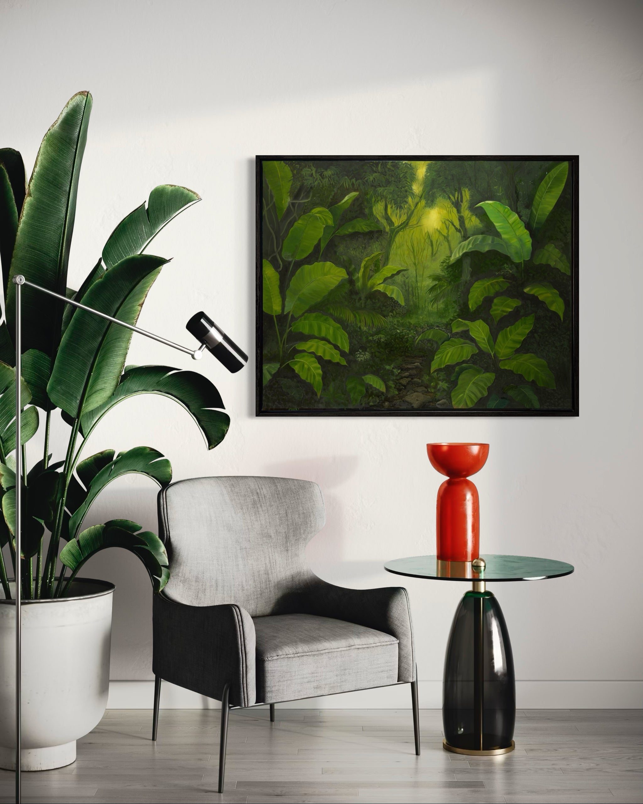 This piece captures the tranquil depth of a tropical forest bathed in glowing green light. A rich palette of greens and yellows creates a soft, almost mysterious atmosphere of quiet vitality.