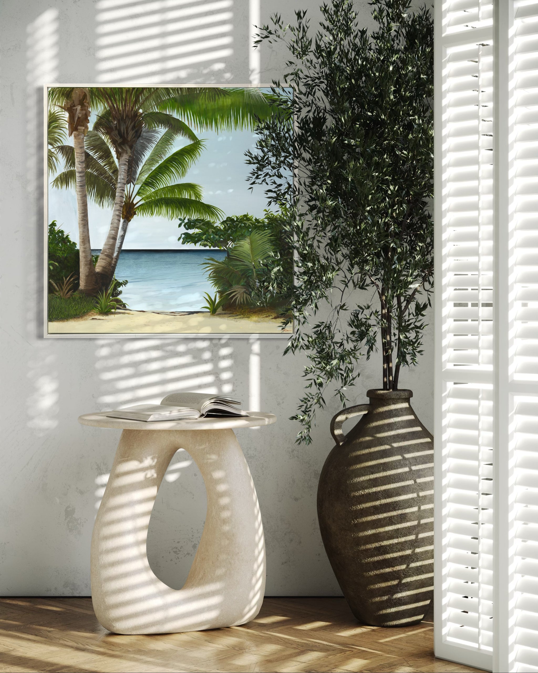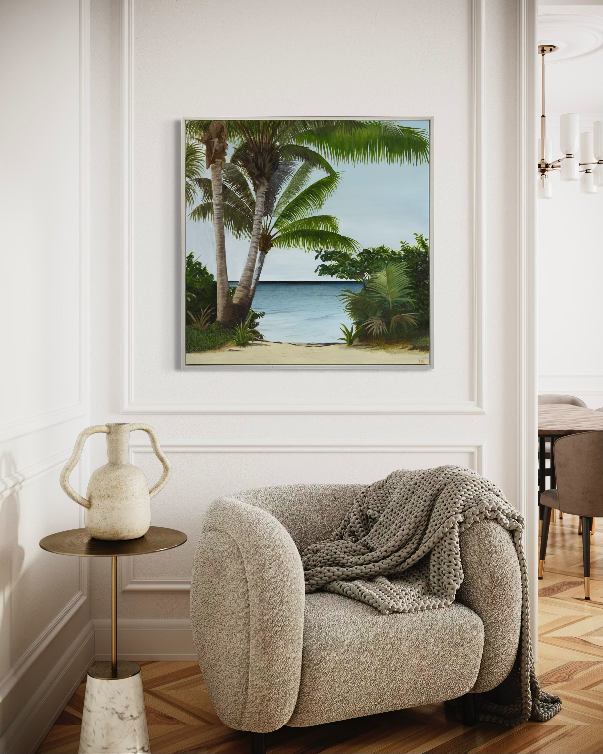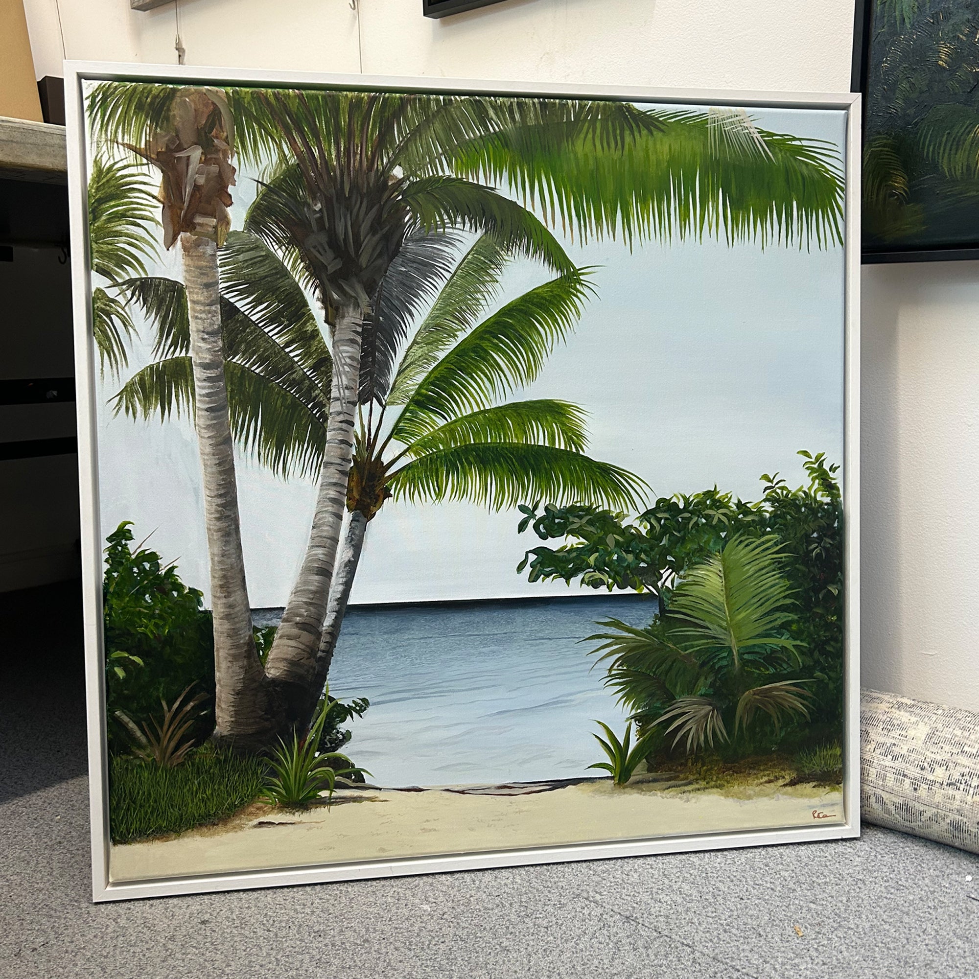 This oil painting captures the peaceful charm of a secluded beach. Painted with careful attention to light and detail, the rich greens, soft blues and warm sandy tones come together to create a sense of escape. Subtle brushwork in the leaves and sand adds texture and depth, while the overall palette remains soothing and balanced. This piece will transform any space with its timeless island tranquility.