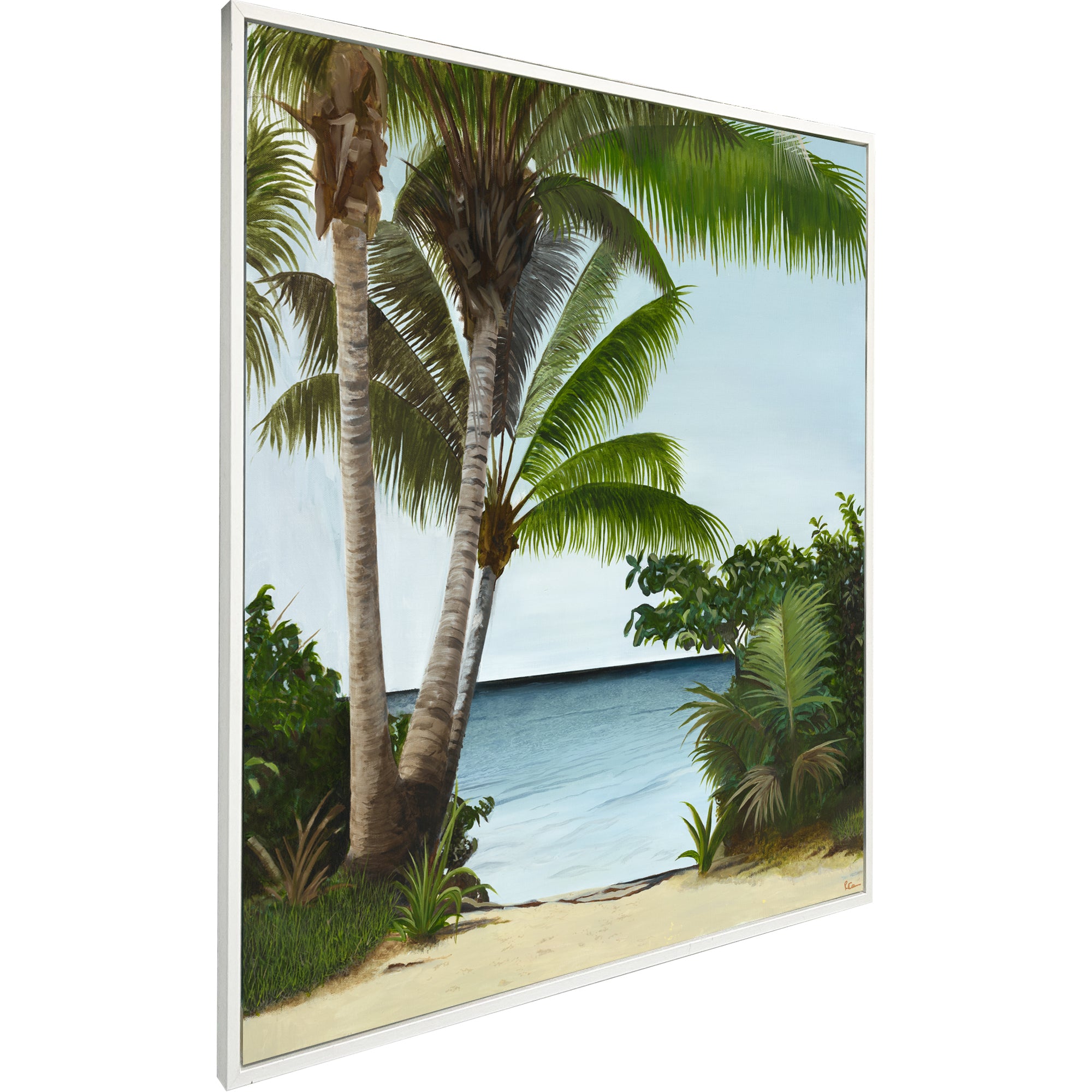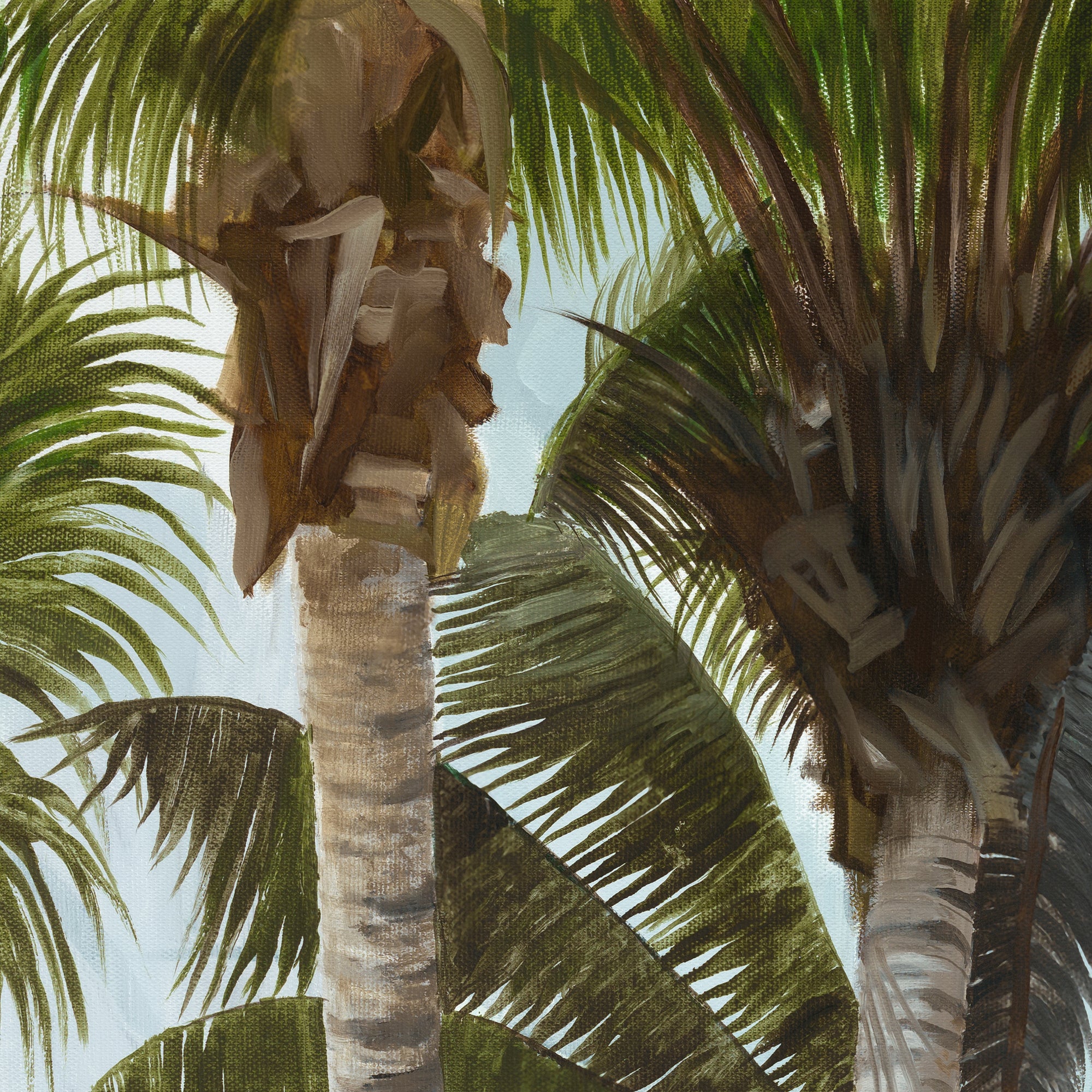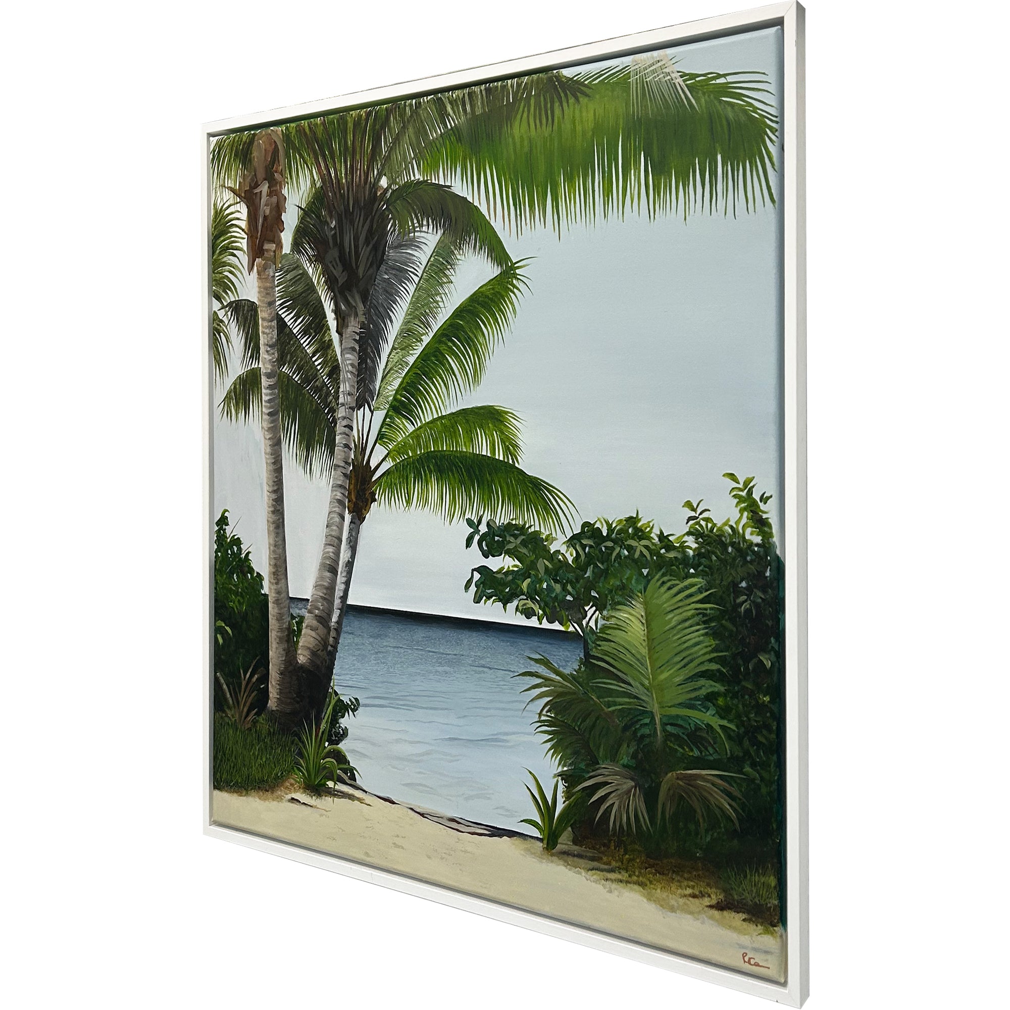 This oil painting captures the peaceful charm of a secluded beach. Painted with careful attention to light and detail, the rich greens, soft blues and warm sandy tones come together to create a sense of escape. Subtle brushwork in the leaves and sand adds texture and depth, while the overall palette remains soothing and balanced. This piece will transform any space with its timeless island tranquility.