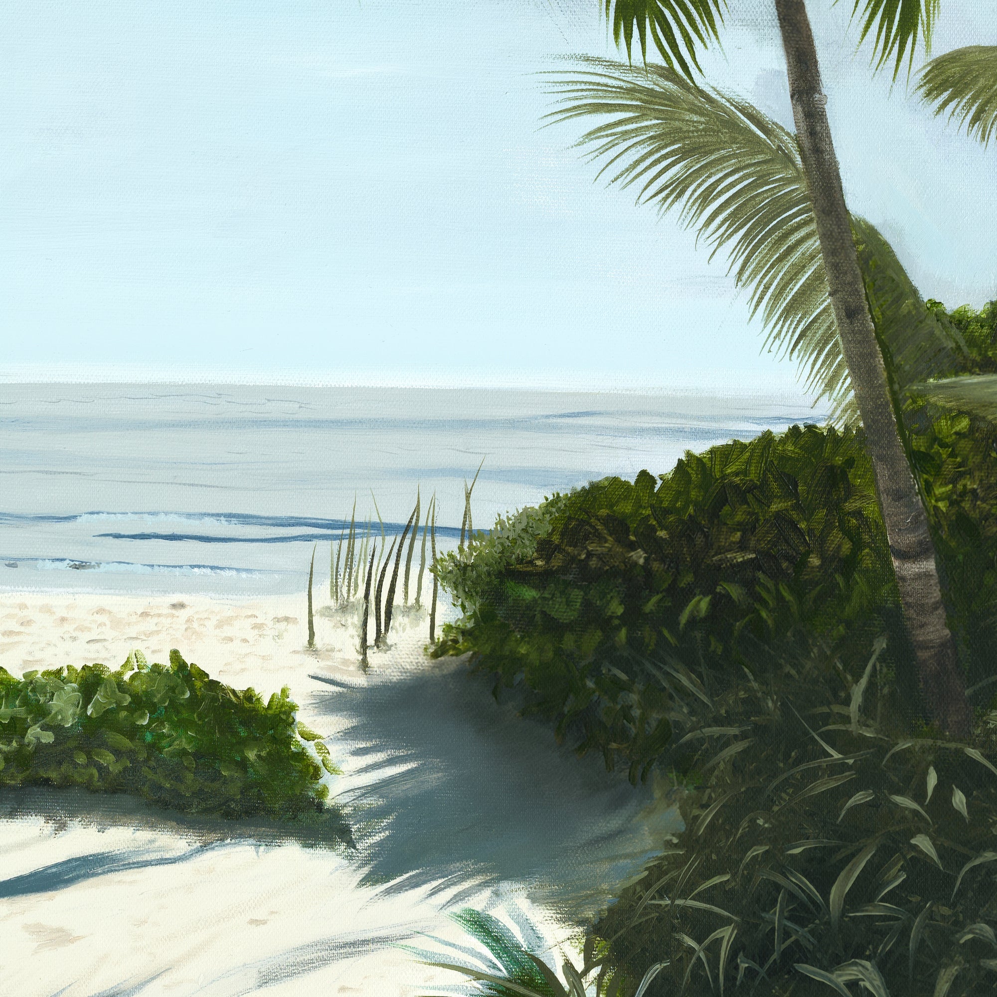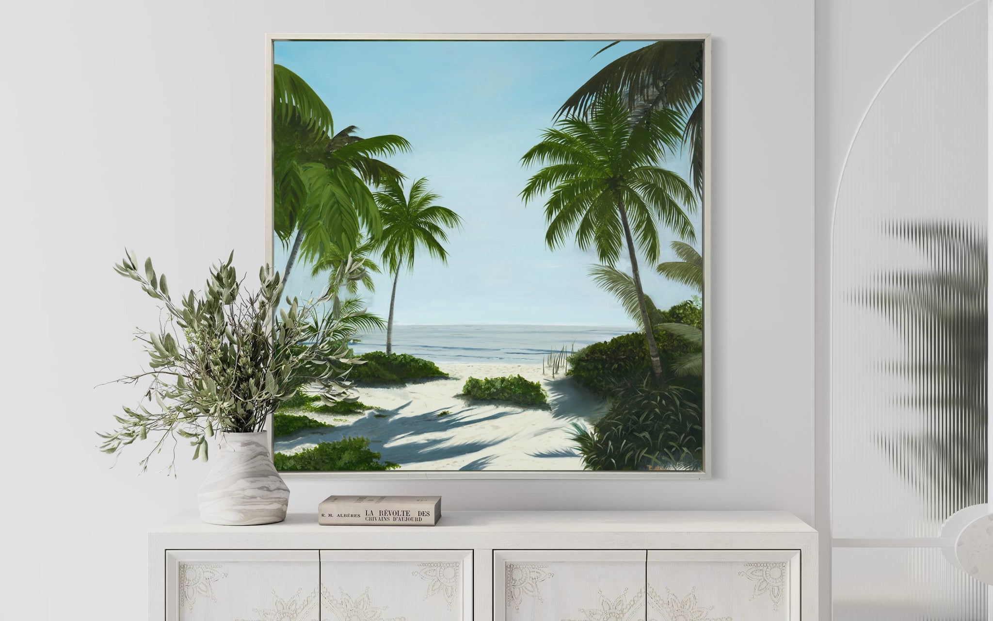 Painted with careful attention to light and shadow, the subtle tonal shifts in the sand and sky enhance depth while the palms provide a natural framing that draws the viewer inward.