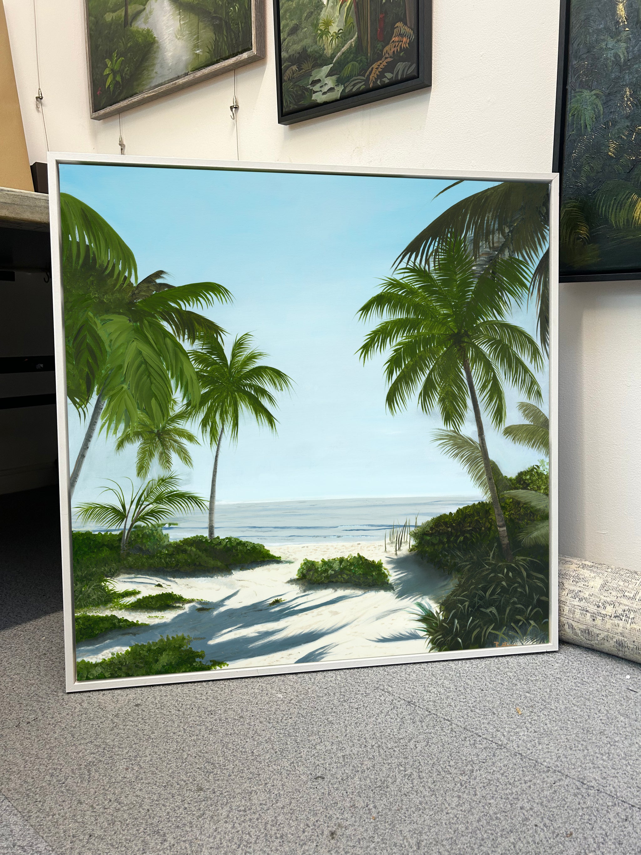 Tropical Shore has been painted on an 80 x 80 cm stretched canvas and set into a white floating frame. The artwork has been varnished and is wired and ready to hang.