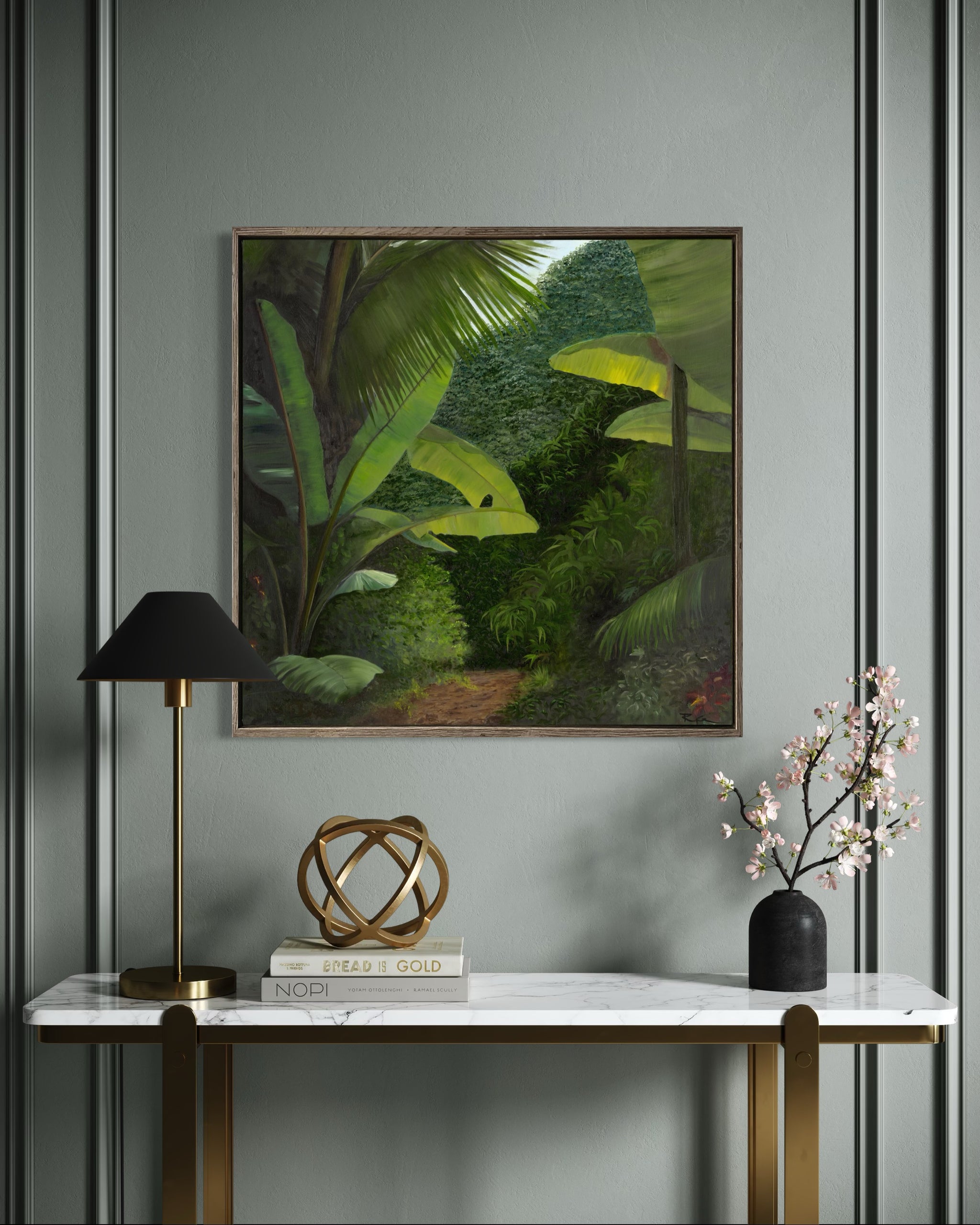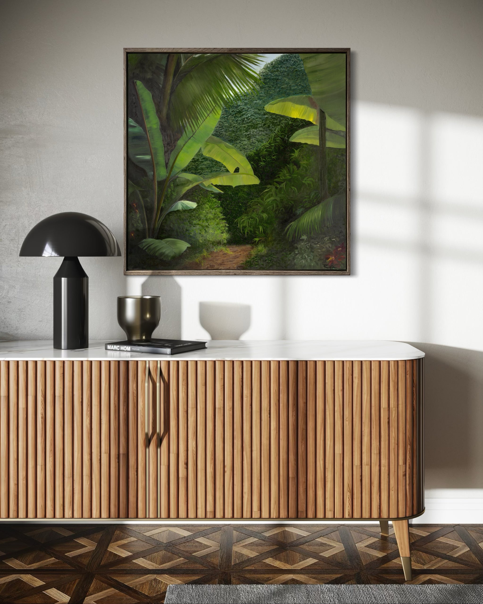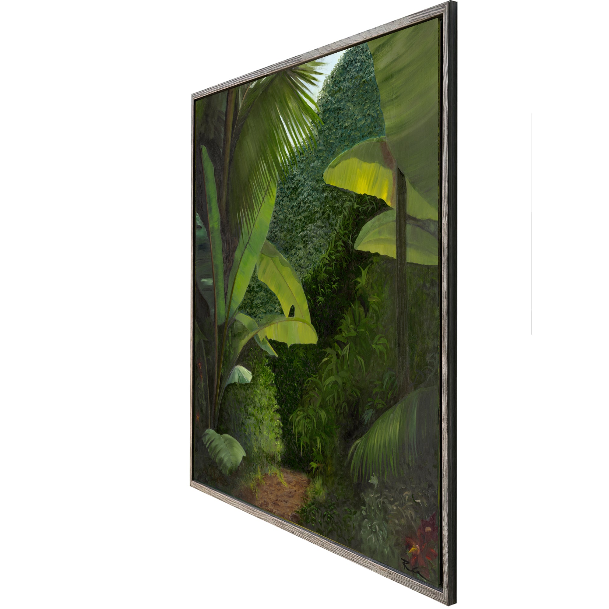 Walk into the Rainforest captures a moment of quiet stillness, where dense foliage opens to reveal a sunlit path leading deeper into the forest. Layered greens and soft light balance out the bold sculptural leaves of banana plants in the foreground. The painting invites peaceful reflection and would be a striking addition to any space.