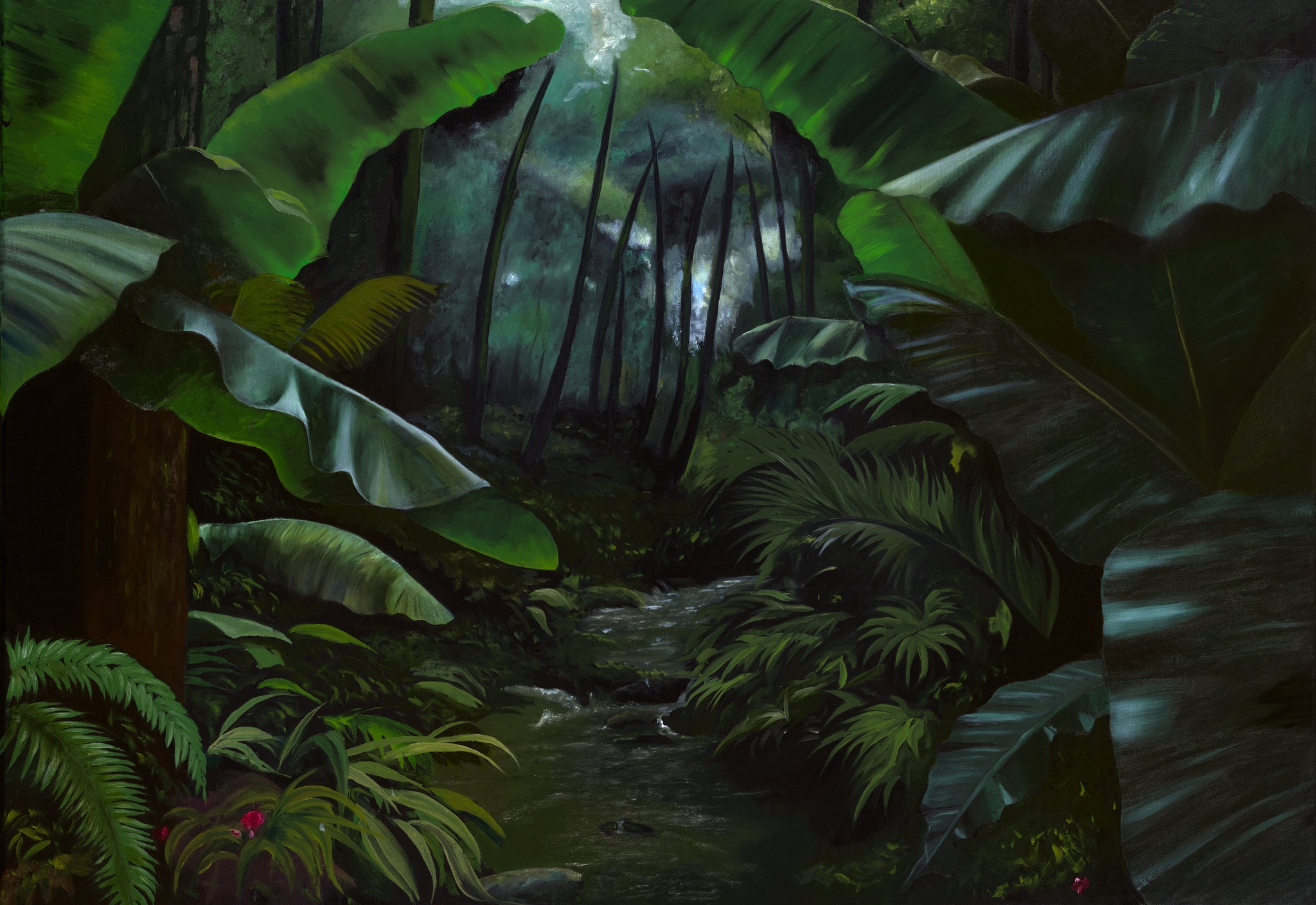 This atmospheric artwork draws the viewer into the heart of the jungle, where layered leaves, deep shadows, and shafts of light create a strong sense of depth and quiet intensity. The rich greens give the piece a moody yet calming presence, making it a striking tropical wall art print for both modern and classic interiors.