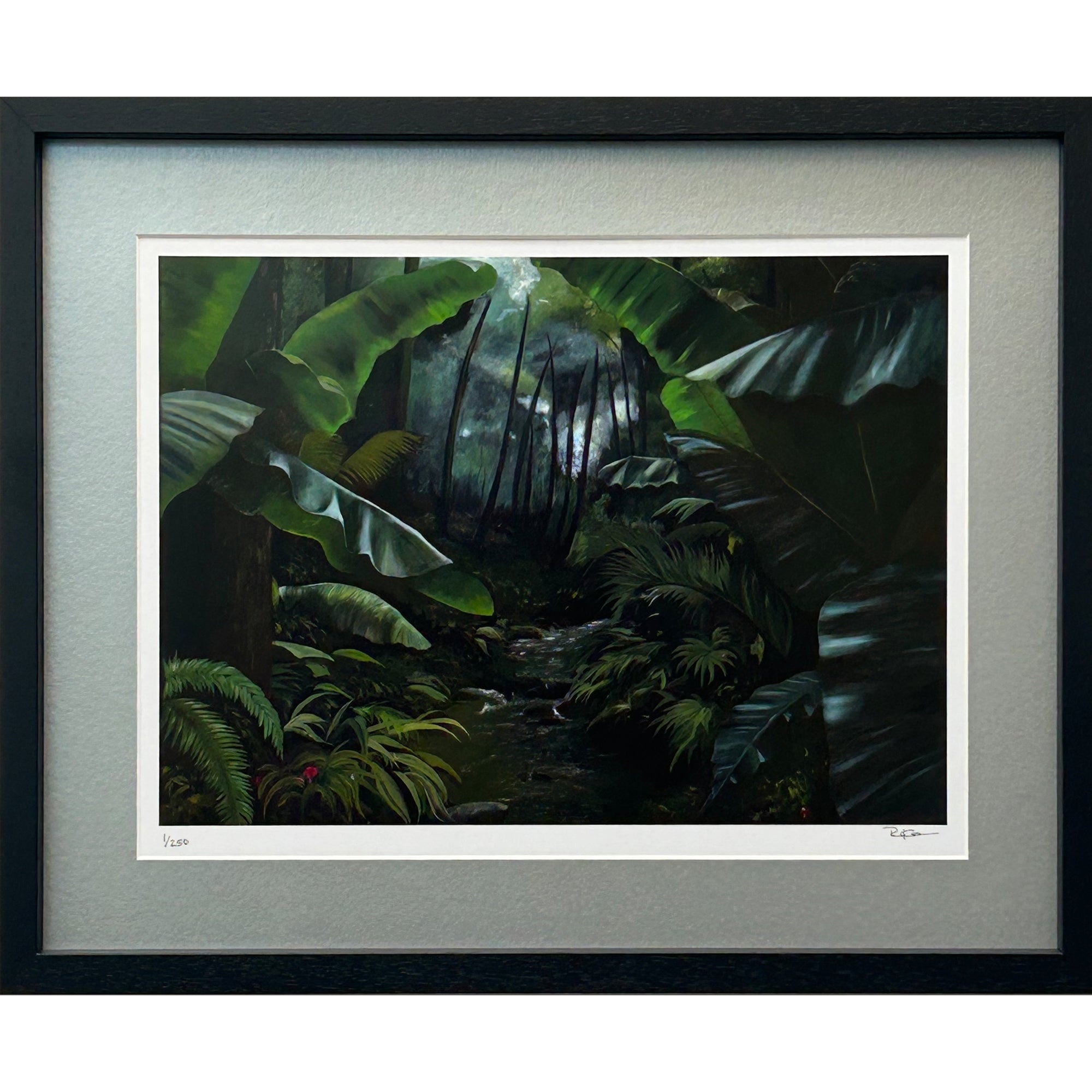 A signed limited edition framed landscape print depicting a dense rainforest scene with dramatic light filtering through tropical foliage, reproduced from an original hand-painted acrylic painting by Robert Kerr.