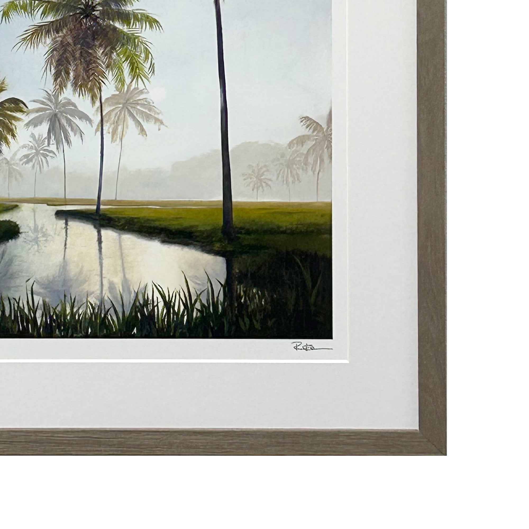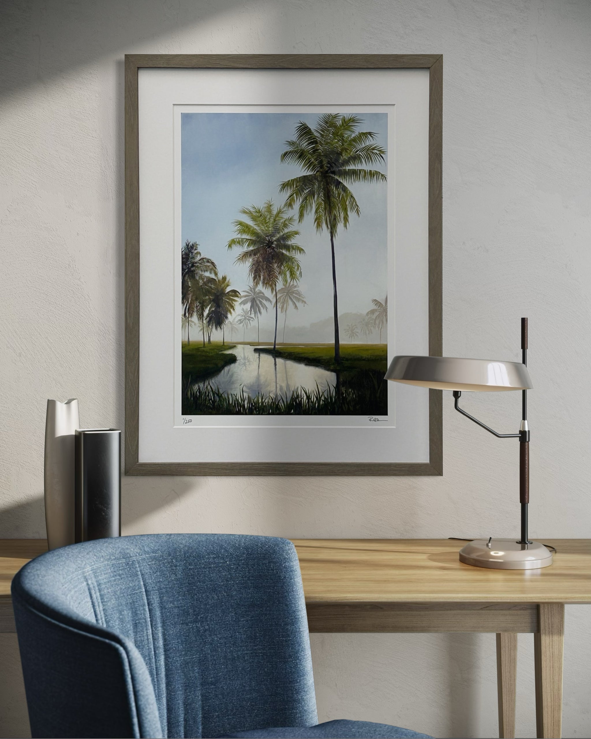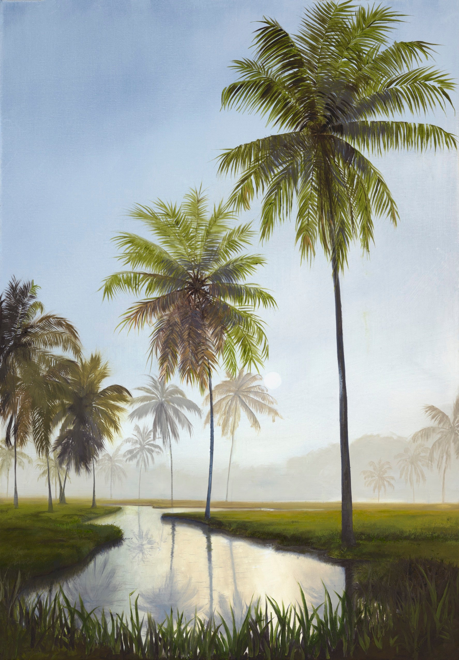 This serene artwork captures the serene beauty of a tropical landscape at dawn. Towering palm trees rise gracefully into the muted blue sky above a reflective stream that winds through a lush field. This piece will bring a touch of tropical tranquility to any space and serves as a reminder of nature's quiet elegance.