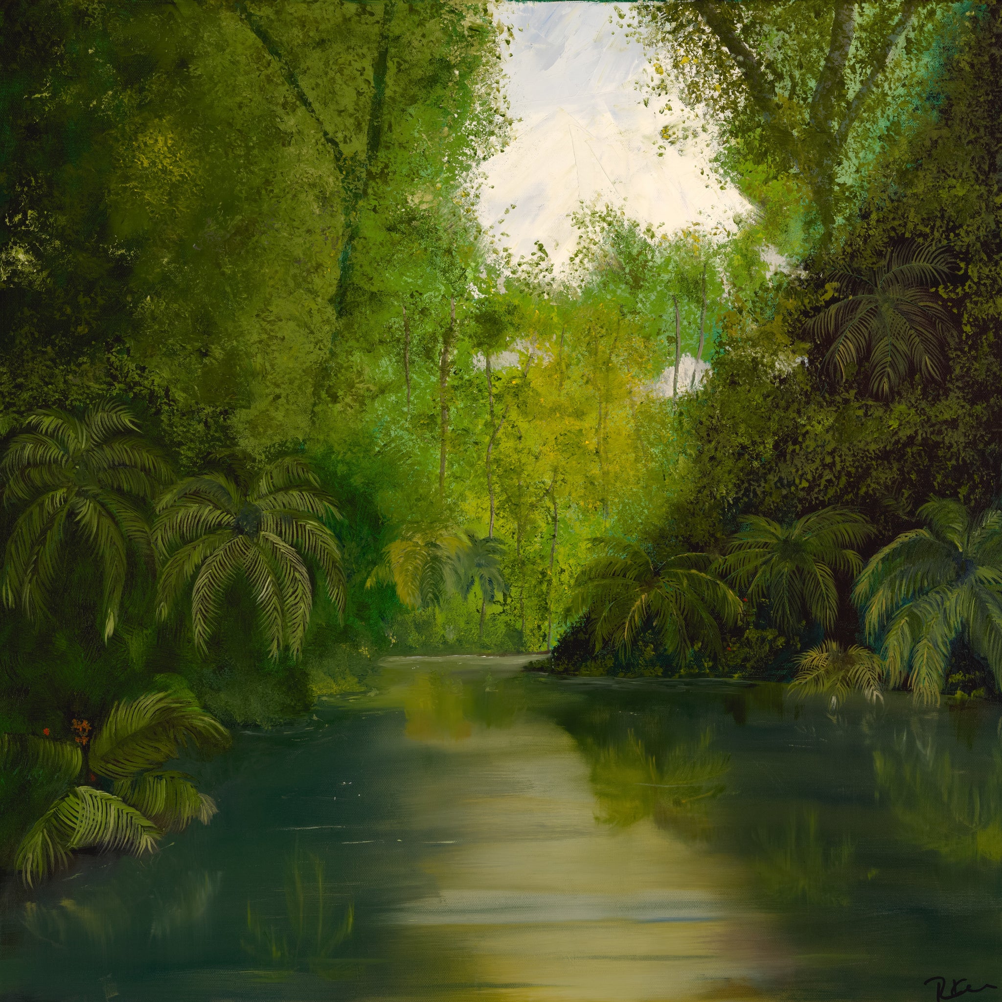 This artwork captures dense green foliage, soft filtered light, and calm water reflections, evoking the stillness and depth of a tropical forest environment. The rich layers of greenery and gentle sense of enclosure create a tranquil, atmospheric piece of nature wall art which will work well in both modern and classic interiors.