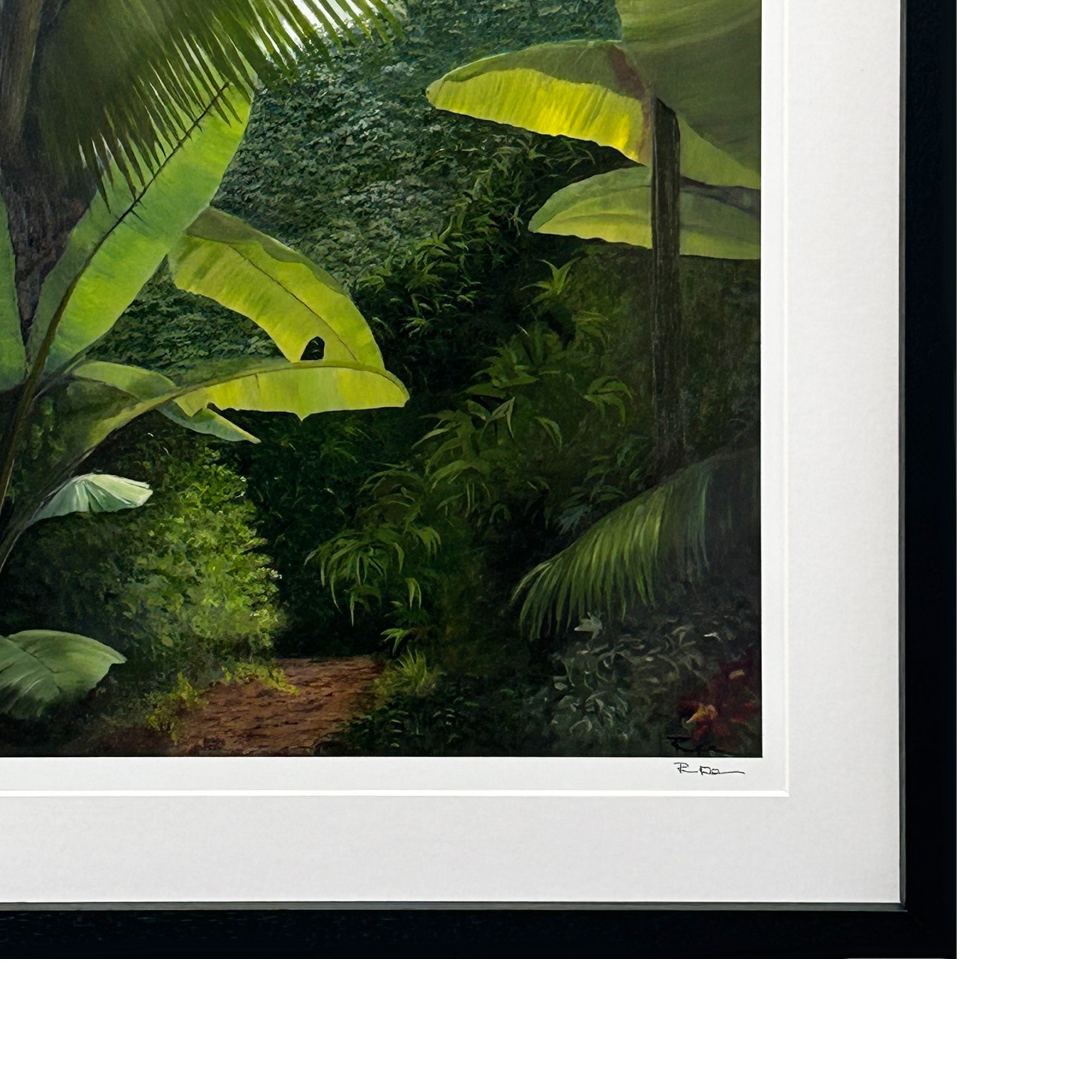 A signed limited edition framed landscape print depicting a sunlit rainforest path surrounded by lush tropical foliage, reproduced from an original hand-painted acrylic painting by Robert Kerr.
