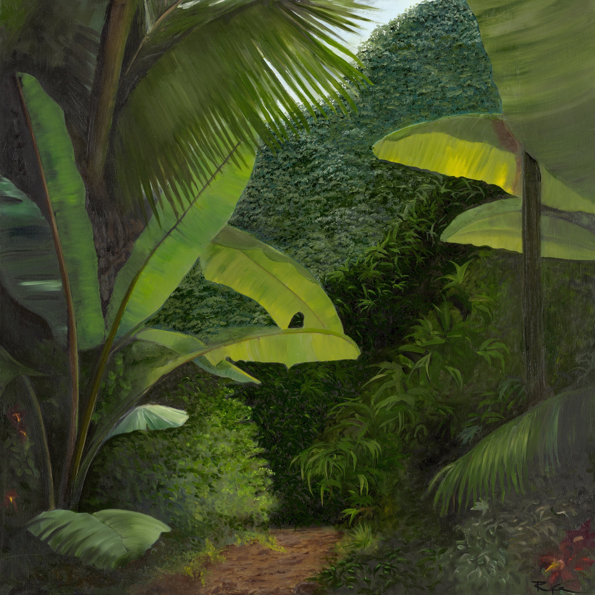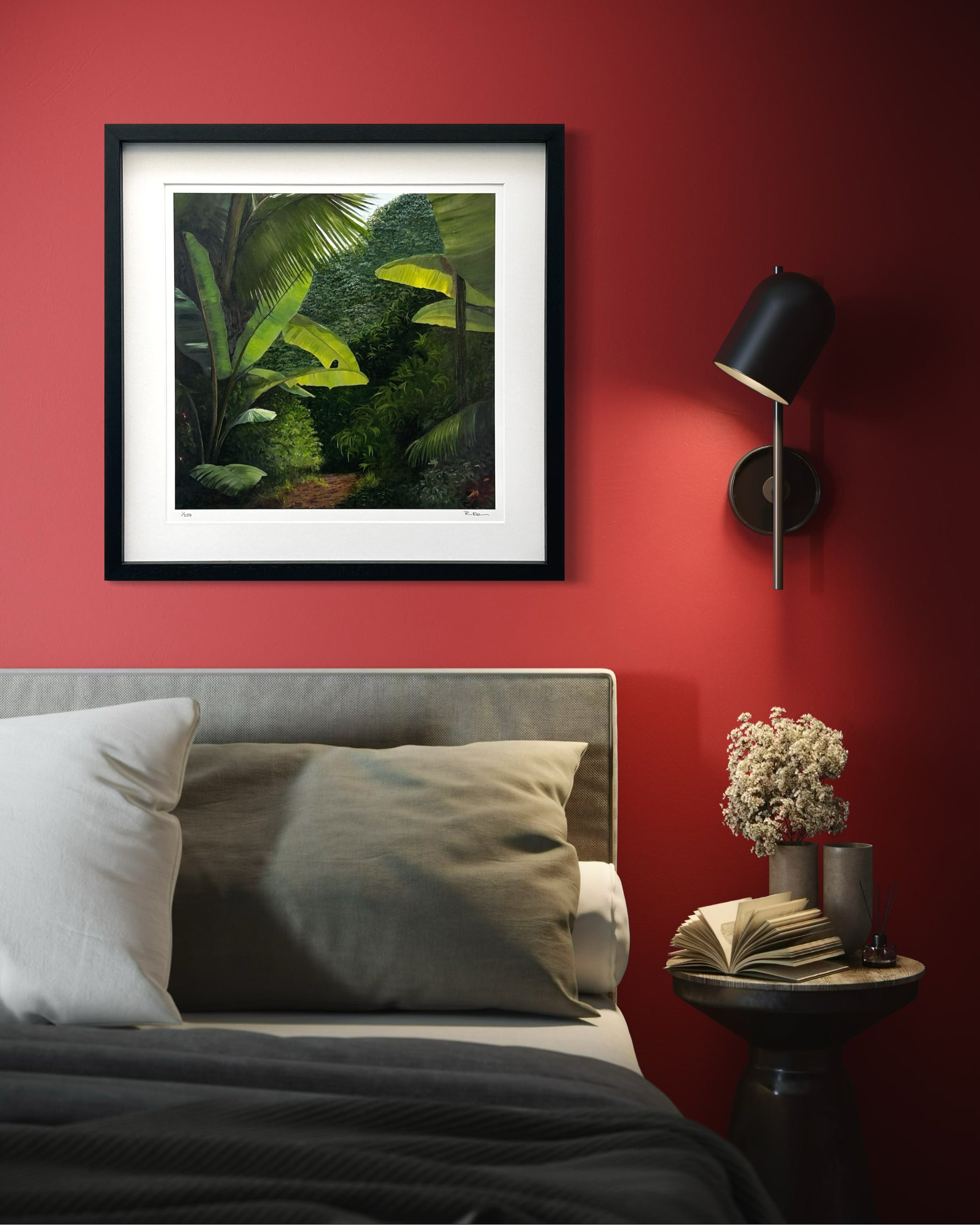 This immersive artwork invites the viewer into dense greenery, with layered leaves, soft light, and a winding path creating a strong sense of depth and quiet movement. The rich green palette and enclosed composition invite peaceful reflection, making this piece an elegant tropical wall art print for any interior space.